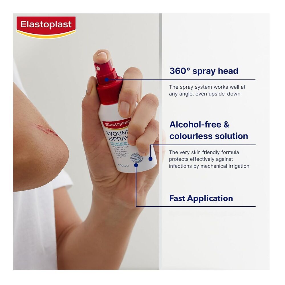 Elastoplast Wound Spray 100mL provides essential cleansing for minor acute wounds including cuts, abrasions, first and minor second-degree burns, and open blisters. This easy-to-use spray is formulated without alcohol, ensuring a pain-free application that won't dry out the skin or cause discomfort, making it ideal for both adults and children. The transparent solution cleanses effectively without staining clothes. Its gentle yet powerful formula is designed to clean wounds thoroughly, removing dirt and impurities that can lead to infection, supporting the natural healing process. The user-friendly spray bottle works well at any angle, making it perfect for on-the-go applications whether at home, in sports, or outdoor activities. Ensure you have the Elastoplast Wound Spray ready for whenever the unexpected happens, providing you with fast and effective wound care. Always read the label and follow the directions for use to ensure safe and optimal use.