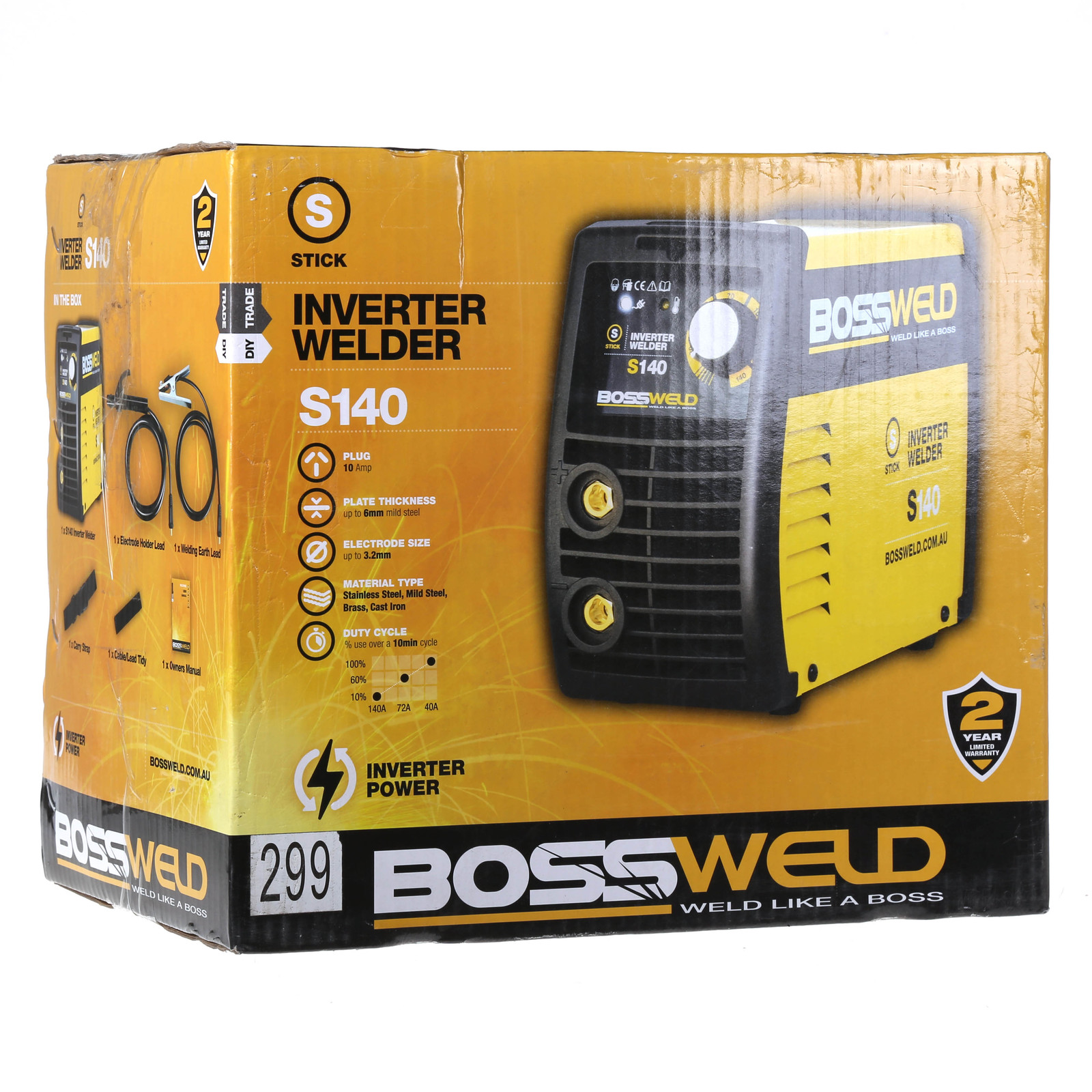 The Bossweld S140 is the latest in IGBT MMA stick electrode welder technology. This very lightweight welding machine is easy to use, generating a very smooth and stable output. Ideal for welding jobs around the home, farm, workshop or on site.