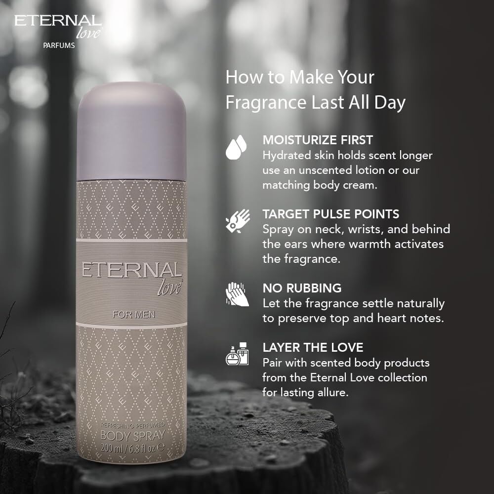 Eternal Love Body Spray is perfect for men. With notes of coriander, cool juniper berry, lush muguet, dewy greens, sparkling mandarin, amber and musk. Fragrant and fresh feeling through out the day. Long lasting protection from body odour. Aromatic fragrance notes that mersmerise your senses.