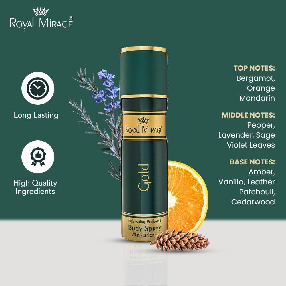 ROYAL MIRAGE 2 x 200ml Unisex Gold Long Lasting Daily Body Deodorant Spray (2 Pack x)