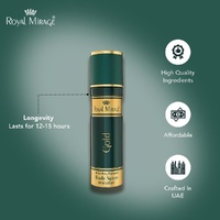 The Royal Mirage Gold Body Deodorant Spray is a luxurious and refreshing fragrance designed for everyday use. With a well-balanced blend of fresh, floral, and warm woody notes, this unisex body spray delivers a clean yet sophisticated scent suitable for all occasions. It opens with bright and fresh accords, followed by a soft floral heart, and settles into a warm base of amber, musk, and woods. This combination creates a long-lasting fragrance that keeps you feeling confident and refreshed throughout the day. Ideal for both men and women, this 200ml deodorant spray provides effective odour protection while offering an elegant scent at an affordable price.