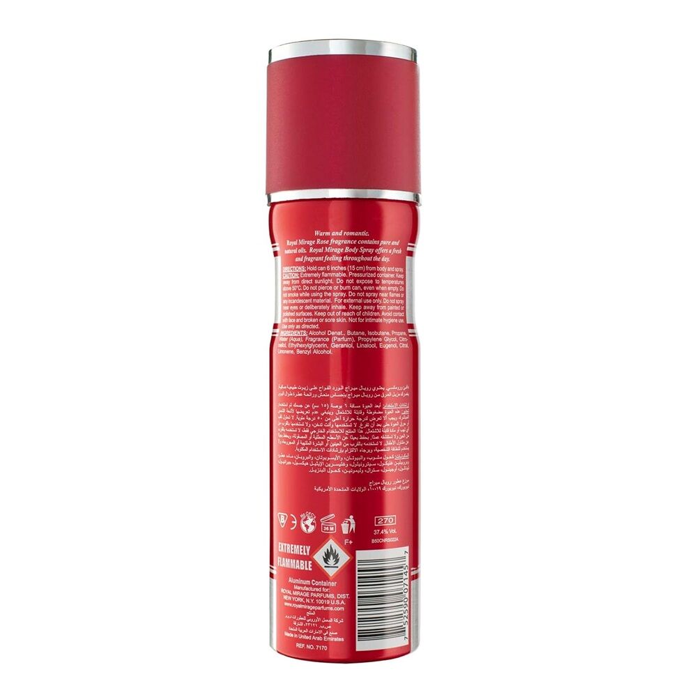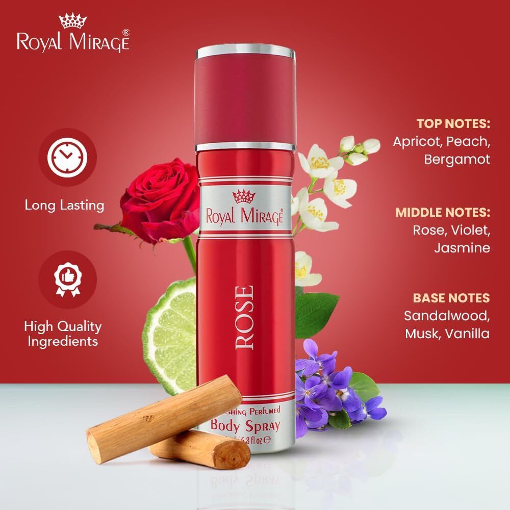 - Royal Mirage Rose Body Spray contains pure and natural oils. This body spray offers a fresh and fragrant feeling throughout the day. A feminine classic and symbol of love. The scent unwinds to a skin-warming, blend of sensual musk, vanilla and luxurious sandalwood
