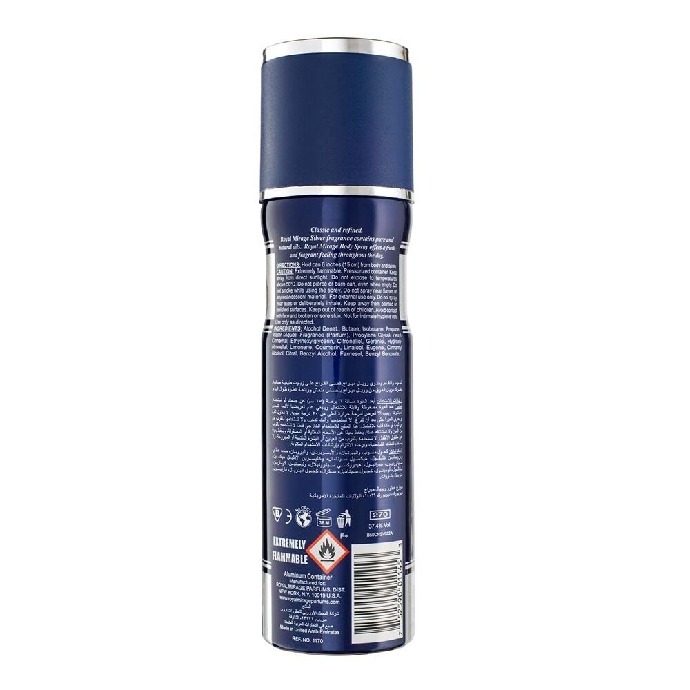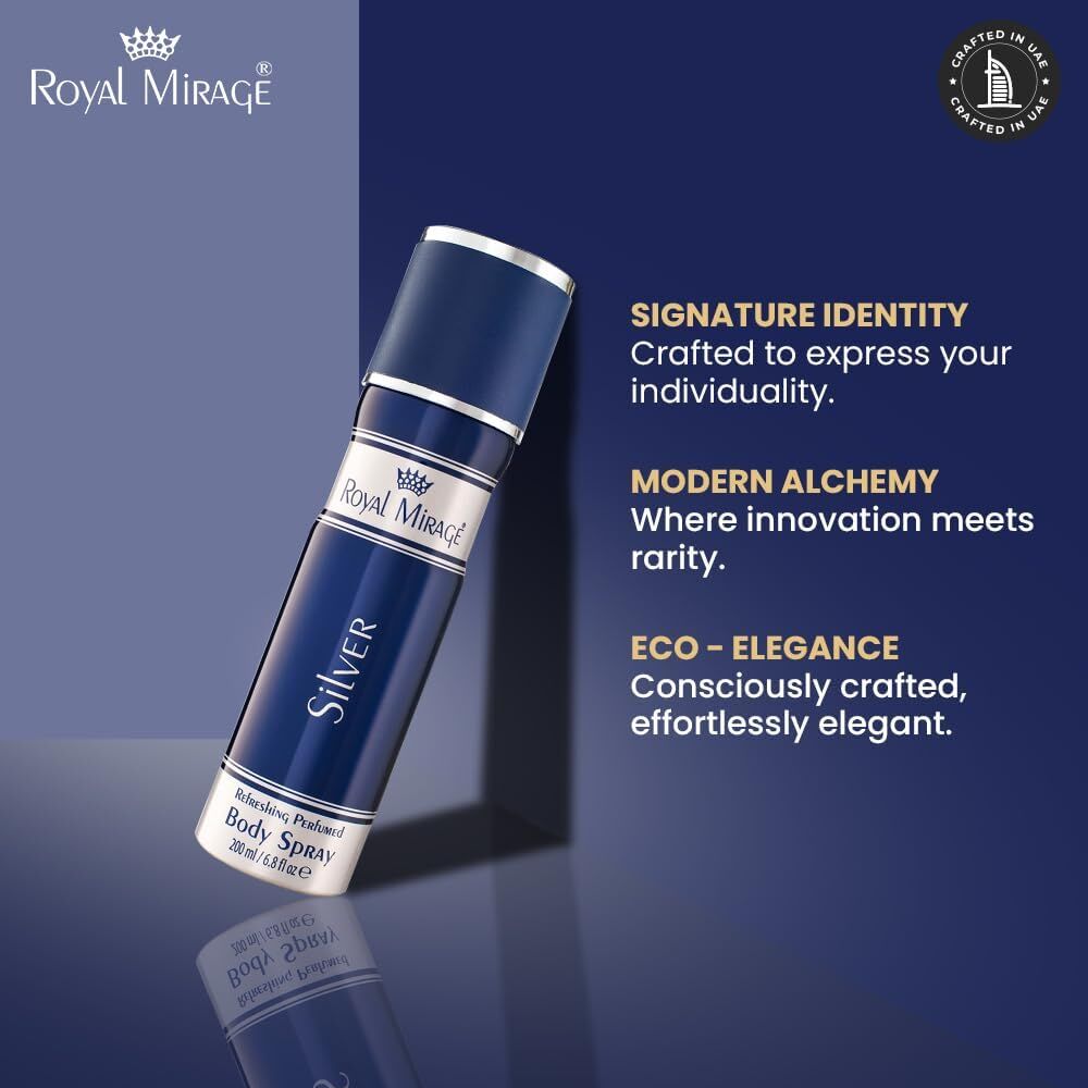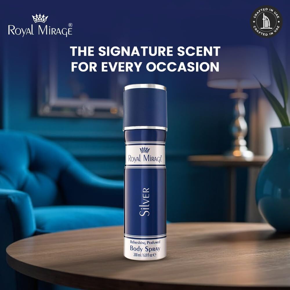 - Royal Mirage Silver Deodorant Body Spray for Men contains pure and natural oils. This body spray offers a fresh and fragrant feeling throughout the day. Fruity top notes of invigorating lemon and bergamot infused with succulent peach reveal a fragrant heart of orris and playful jasmine.