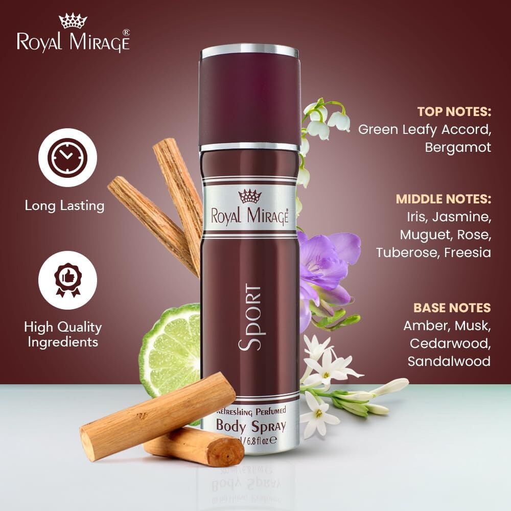 The Royal Mirage Sport Body Deodorant Spray for Men is an energizing and refreshing fragrance designed for active lifestyles. With a dynamic blend of citrus freshness and aromatic notes, this body spray delivers long-lasting protection against body odour while keeping you feeling fresh and confident throughout the day. Opening with vibrant citrus accords, it transitions into a clean aromatic heart and finishes with subtle woody and musky undertones. Perfect for workouts, daily activities, or on-the-go use, this 200ml spray provides a crisp and masculine scent that keeps up with your routine.