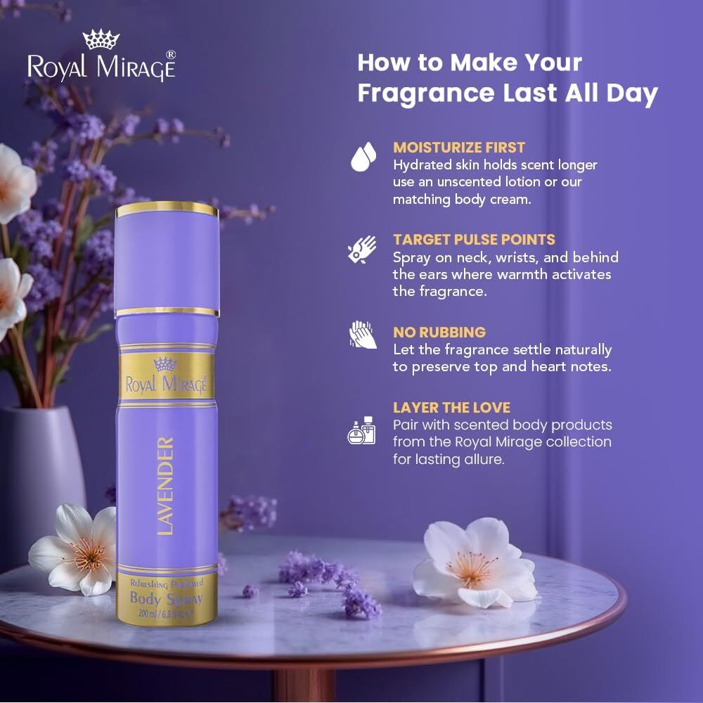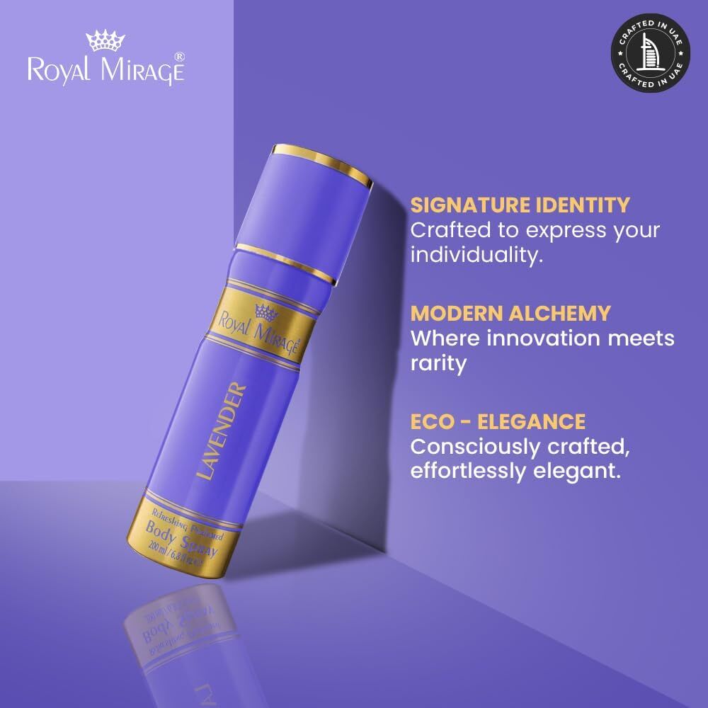 Royal Mirage Lavender Body Deodorant Spray is a refreshing and calming fragrance designed for everyday use. Infused with the soothing essence of lavender, this body spray delivers a light floral scent that keeps you feeling fresh and confident throughout the day. With a balanced blend of fruity, floral, and musky notes, it offers a clean and elegant fragrance profile suitable for both men and women. Perfect for daily wear, work, or casual outings, this 200ml spray provides long-lasting freshness in a convenient and affordable format.