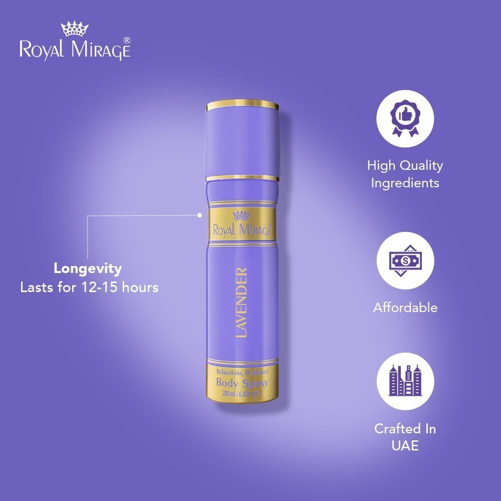 ROYAL MIRAGE 3 x 200ml Unisex Lavender Long Lasting Daily Body Deodorant Spray (3 Pack x)