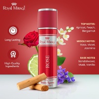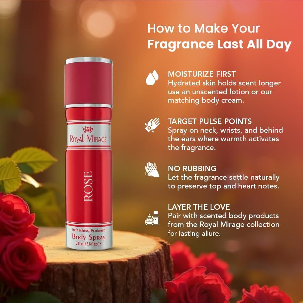- Royal Mirage Rose Body Spray contains pure and natural oils. This body spray offers a fresh and fragrant feeling throughout the day. A feminine classic and symbol of love. The scent unwinds to a skin-warming, blend of sensual musk, vanilla and luxurious sandalwood