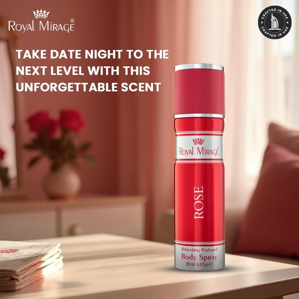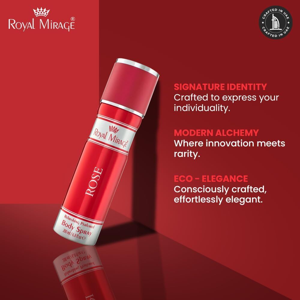The Royal Mirage Rose Body Deodorant Spray is a refreshing and elegant fragrance designed for everyday use. Infused with the timeless scent of rose, this body spray delivers a soft floral aroma balanced with fresh and musky undertones, making it suitable for both men and women. Its light yet long-lasting formula helps keep you feeling fresh while providing effective protection against body odour throughout the day. Perfect for daily wear, work, or casual outings, this 200ml spray offers a classic fragrance experience in an affordable and convenient format.