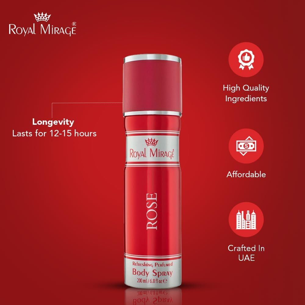 ROYAL MIRAGE 3 x 200ml Unisex Rose Long Lasting Daily Body Deodorant Spray (3 Pack x)