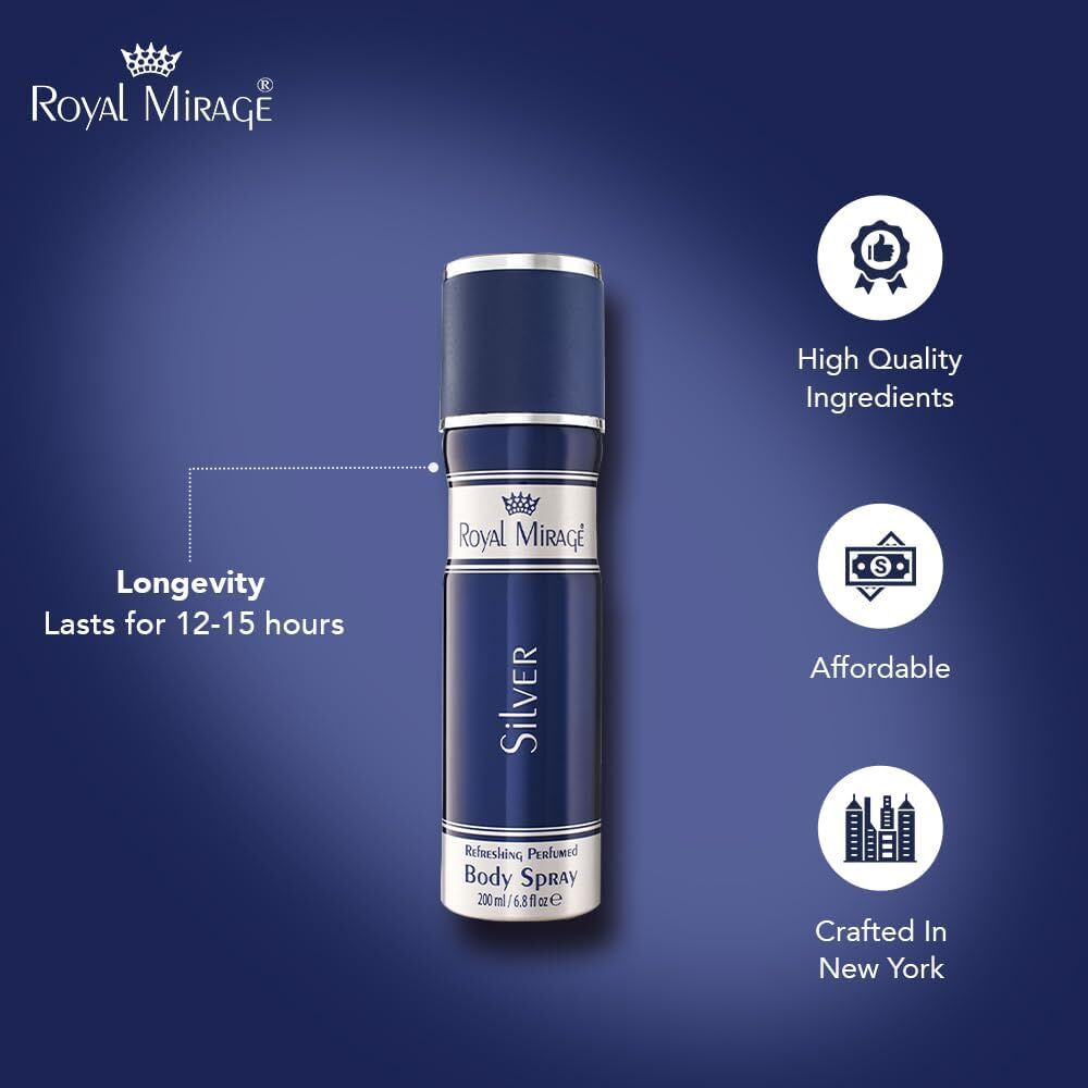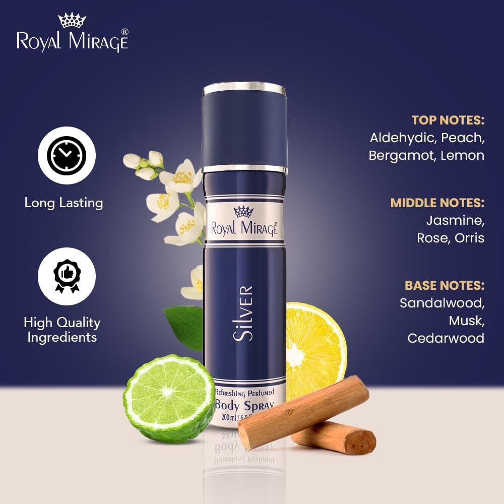 - Royal Mirage Silver Deodorant Body Spray for Men contains pure and natural oils. This body spray offers a fresh and fragrant feeling throughout the day. Fruity top notes of invigorating lemon and bergamot infused with succulent peach reveal a fragrant heart of orris and playful jasmine.