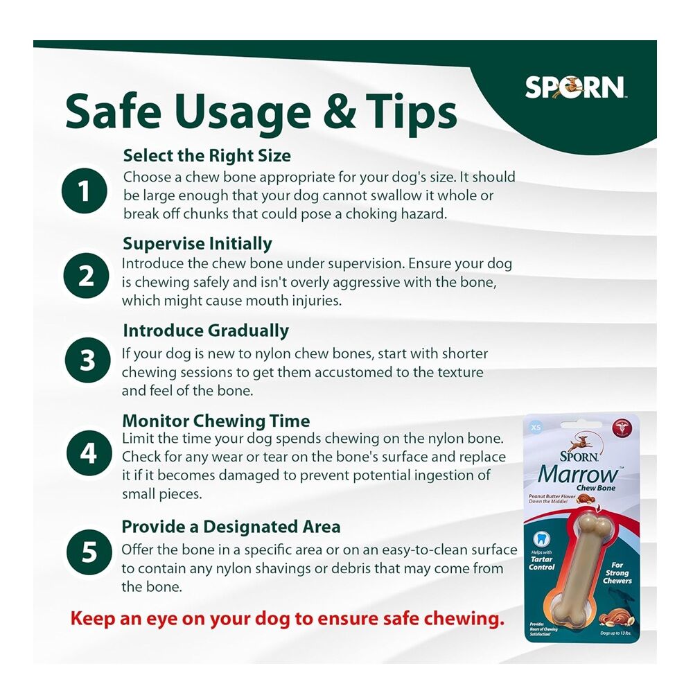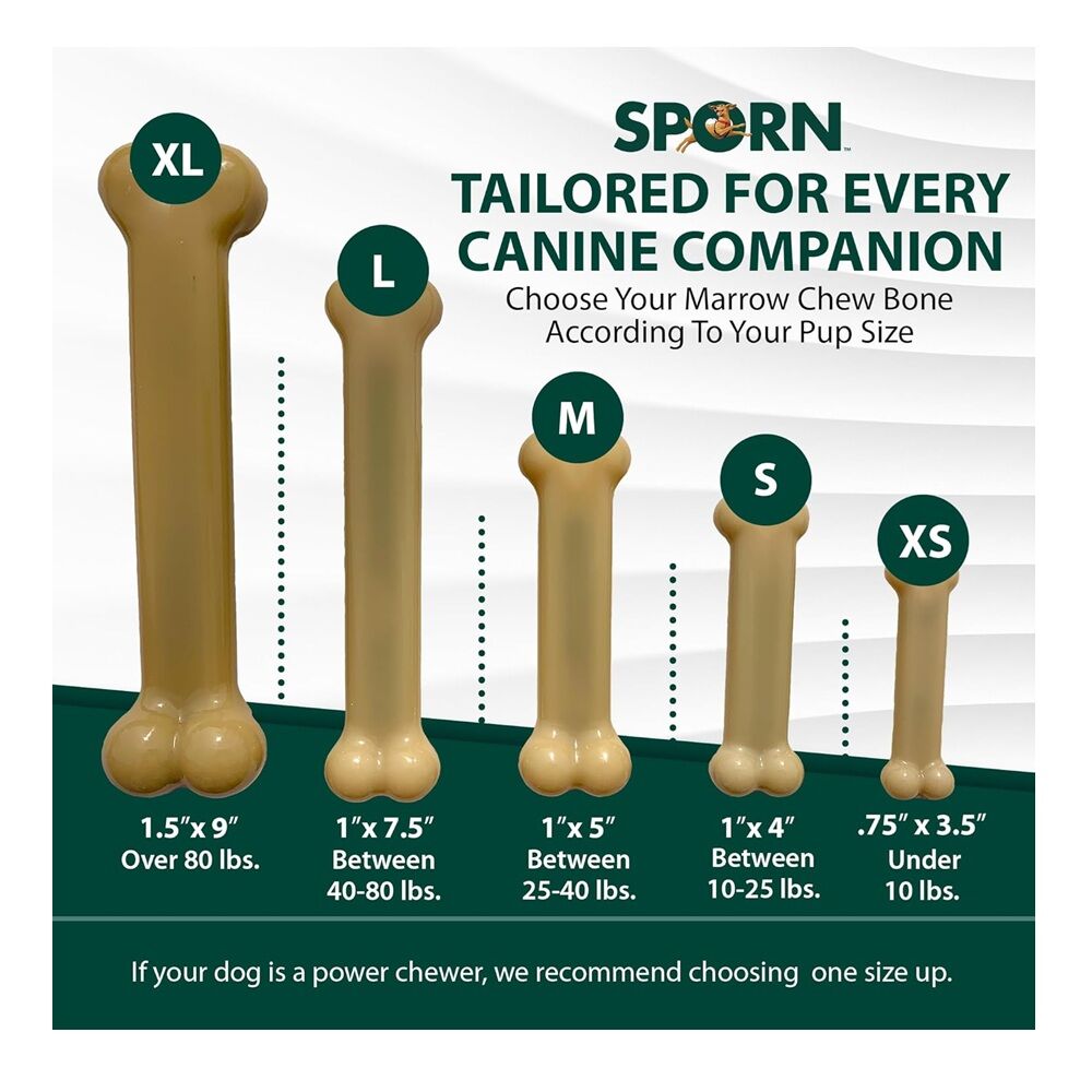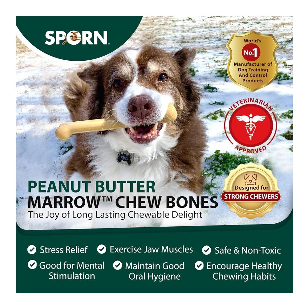Sporn Peanut Butter Marrow Dog Chew Bones are chewable nylon bones with "peanut butter flavor down the middle". Perfect for strong chewers, nylon shavings act like a toothbrush and help remove tartar from the dog's teeth. Provide hours and hours of entertainment and even treats.