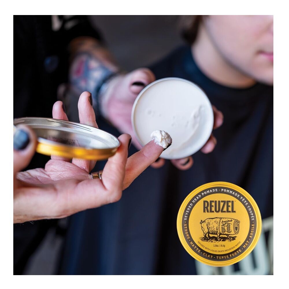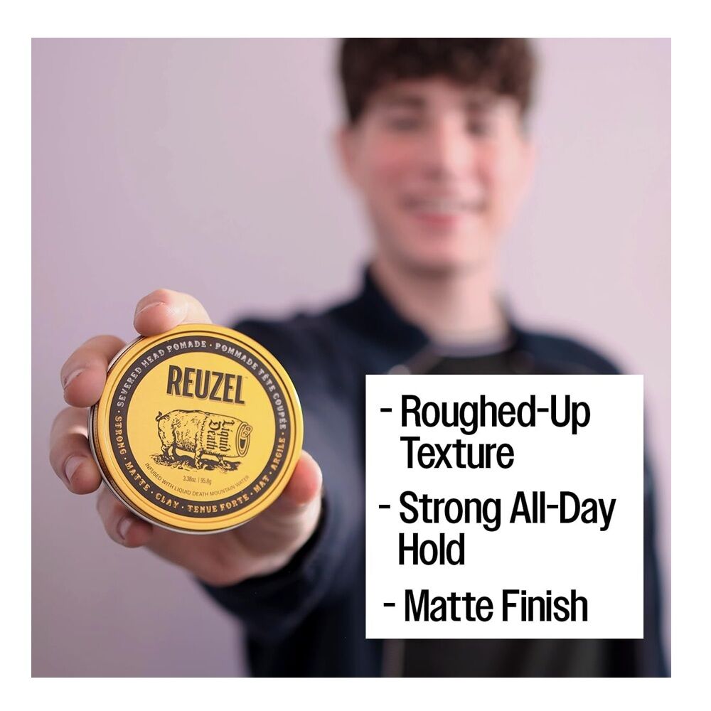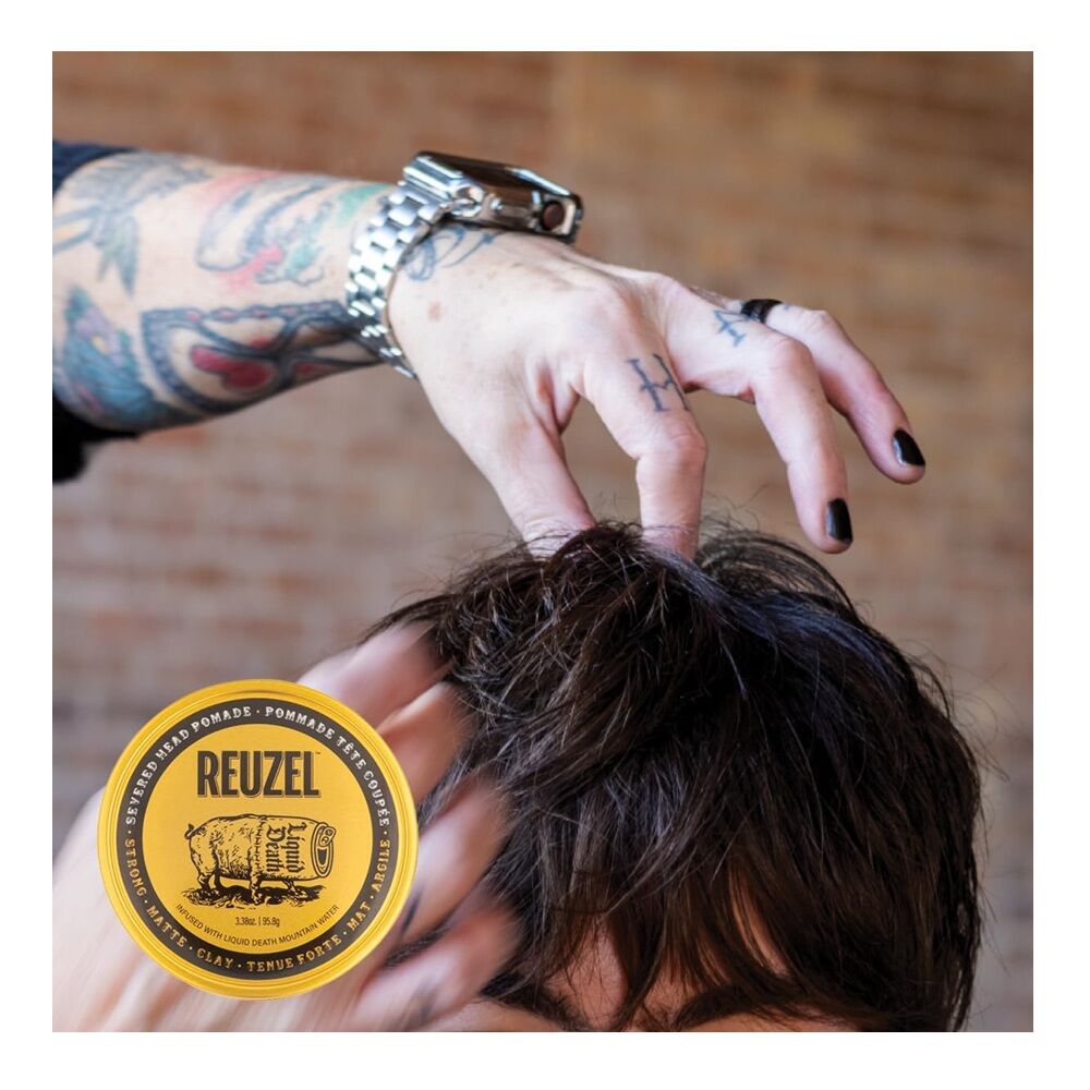 Experience the superior quality of Reuzel's Liquid Death Severed Head Pomade, a leading choice in men's grooming pomade. This pomade for men is masterfully formulated with Liquid Death Mountain Water, featuring a unique blend of nourishing elements such as argan oil and aloe. These ingredients provide moisturizing and conditioning properties that maintain the health of your hair while adding a stylishly disheveled look. This men's hair product offers a strong hold, ideal for creating piecey and roughed-up textures. The matte finish of this strong hold pomade for men eliminates shine, adding to a more natural and subtle aesthetic. It's the perfect clay pomade for men who want to add natural definition and texture to their hair.