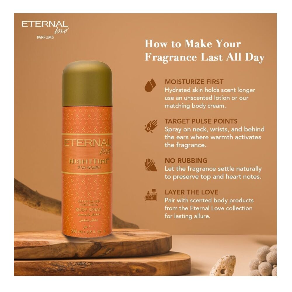 Eternal Love Night Time Body Spray is perfect for women. Simple and sexy combination. Top notes of sensual aldehydes are supported by various floral tints and balanced by balsam and musk. A unique modern scent that creates a lasting impression. Suitable for everyday wear and special occasions.