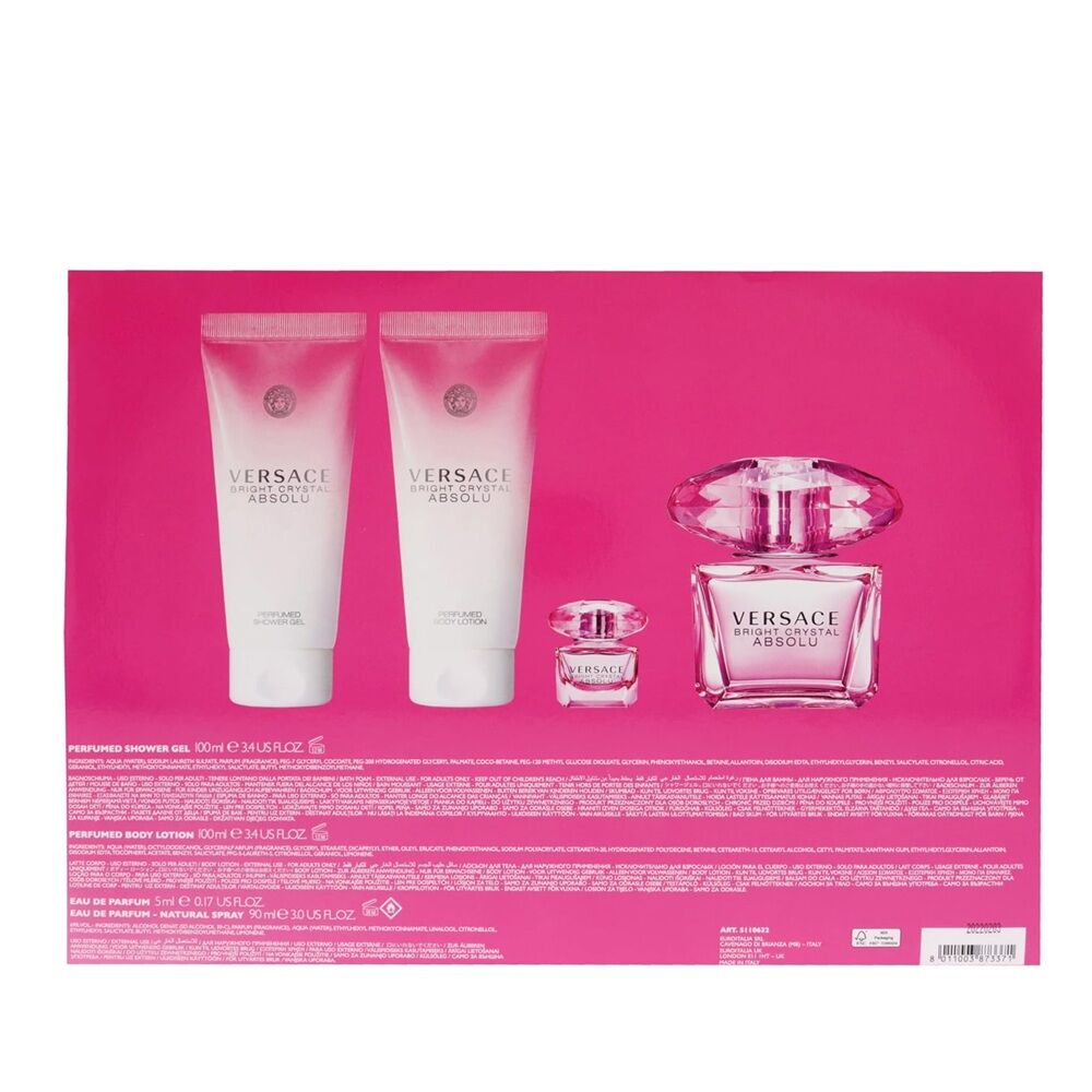The Versace Bright Crystal Absolu 4-Piece Gift Set for Women is a luxurious fragrance collection designed for elegance and long-lasting scent. Featuring the iconic Bright Crystal Absolu Eau De Parfum, this set delivers a richer and more intense version of the classic Bright Crystal fragrance. With a beautifully balanced blend of fruity and floral notes, including pomegranate, yuzu, peony, and raspberry, it creates a fresh yet sensual aroma that lasts throughout the day. The included body lotion and shower gel enhance the fragrance layering experience, while the mini spray is perfect for travel or on-the-go use. Perfect as a premium gift or personal indulgence, this set offers both luxury and value in one elegant package.
