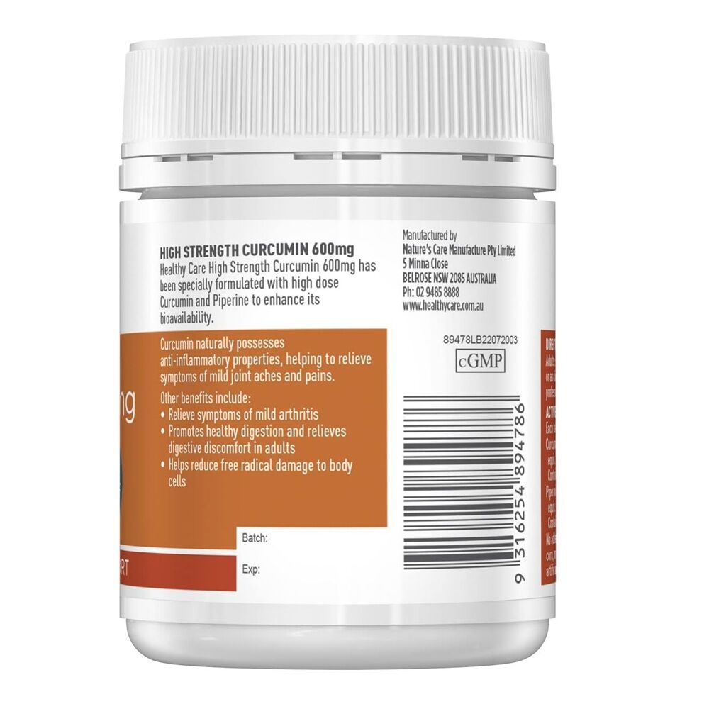Health Care High Strength Curcumin 600mg naturally provides anti-inflammatory benefits and helps relieve digestive discomfort. One-a-day. Healthy Care High Strength Curcumin 600mg has been specially formulated with high dose Curcumin and Piperine to enhance its bioavailability. Curcumin naturally possesses anti-inflammatory properties, helping to relieve symptoms of mild joint aches and pains.