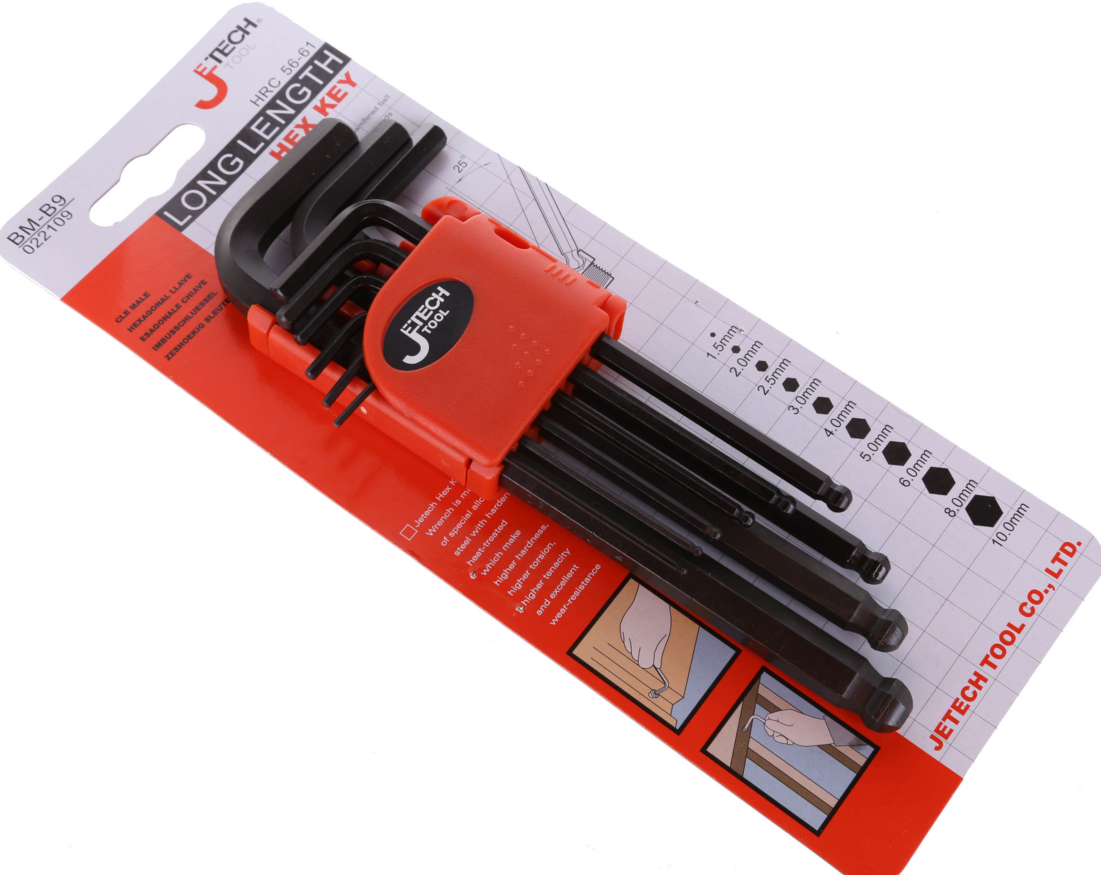 The Extra Long JETECH Hex Keys are made of special alloy steel with heat-treated steel for durability and harness rating of HRC 56-61. The hex key sizes range from 1.5mm - 10.0mm for any job requiring them and are long to allow for extra torque in tougher jobs.