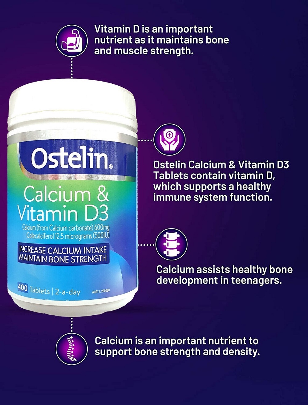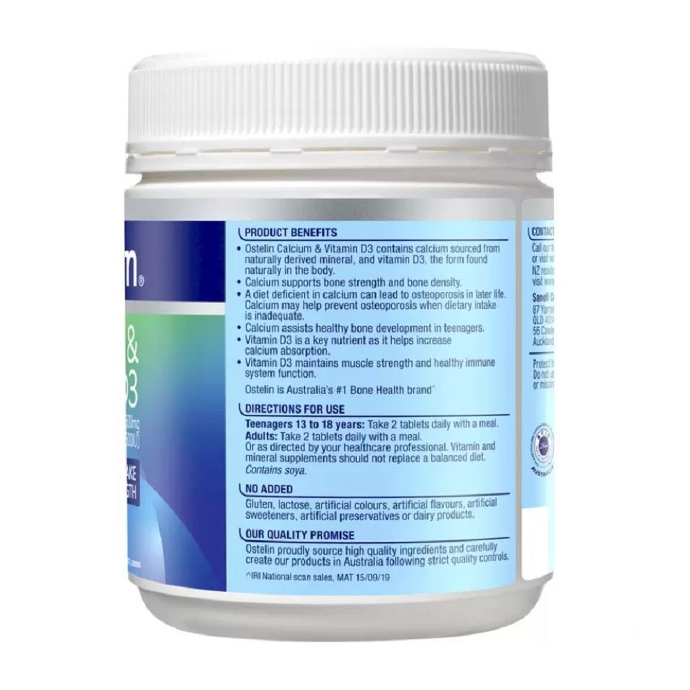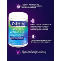 Ostelin Calcium & Vitamin D3 is a combination supplement with naturally occurring calcium and vitamin D3. Calcium may increase bone mineral density, assists normal healthy bone development in teenagers, and is essential in youth and throughout life to maximise and strengthen bones. Calcium may also assist in the prevention of osteoporosis when dietary intake is inadequate. Vitamin D helps with calcium absorption, helps support muscle function and may help maintain a healthy immune system.