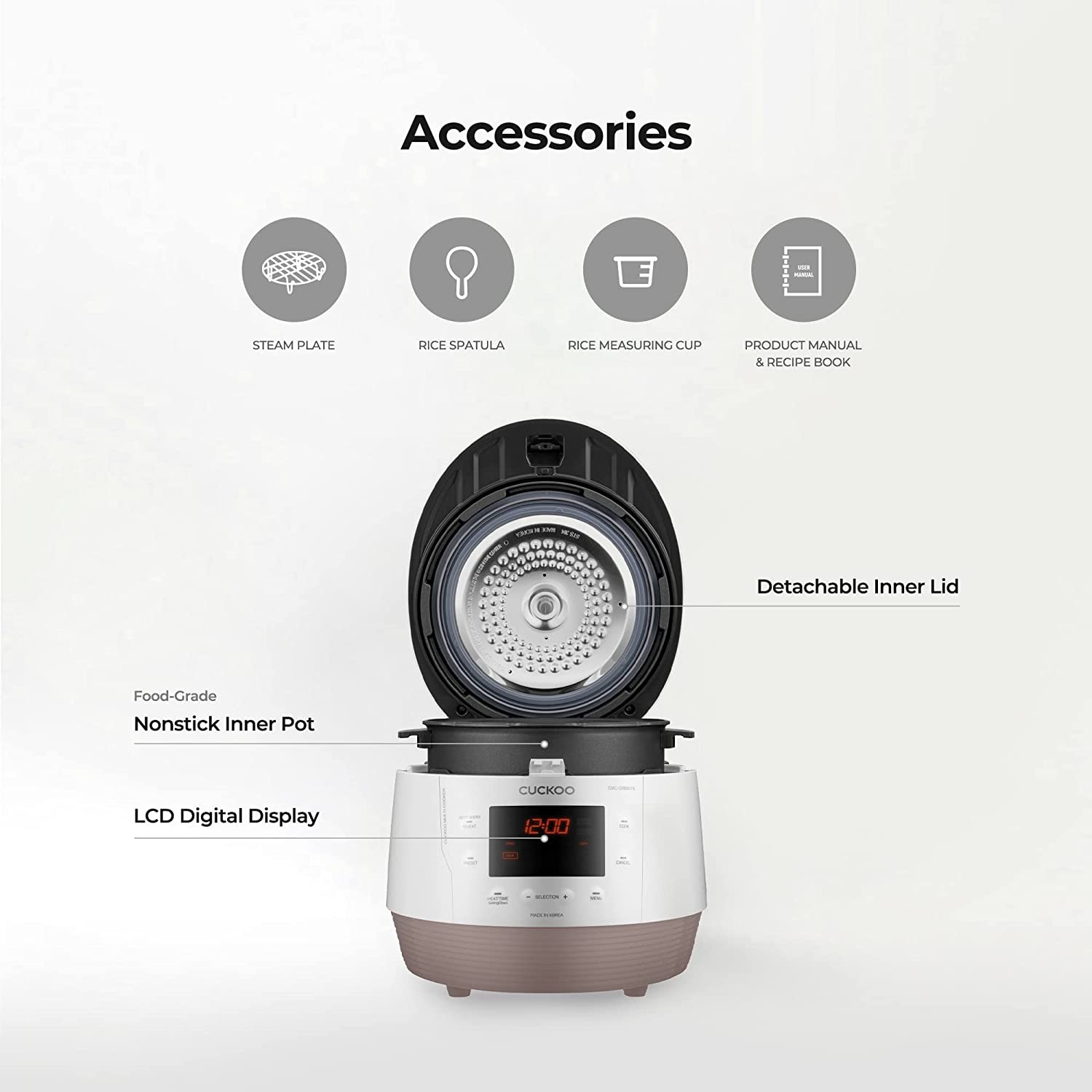 - ACCESSORIES INCLUDED: Rice spatula, rice measuring cup, detachable inner lid, steam plate, product manual, and recipe book