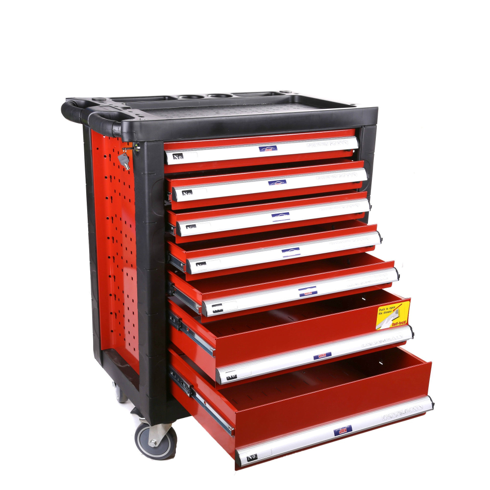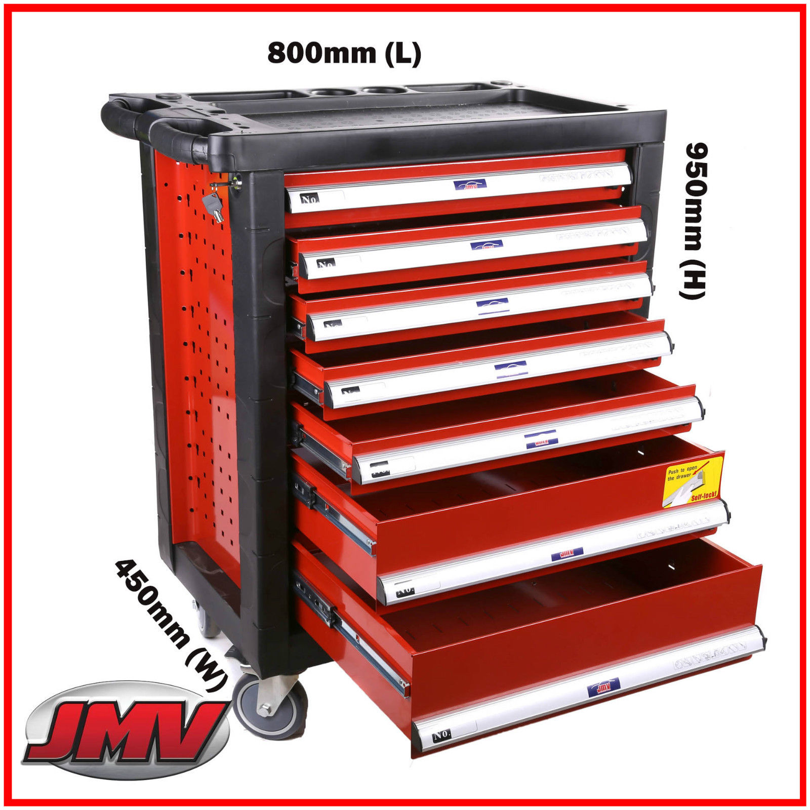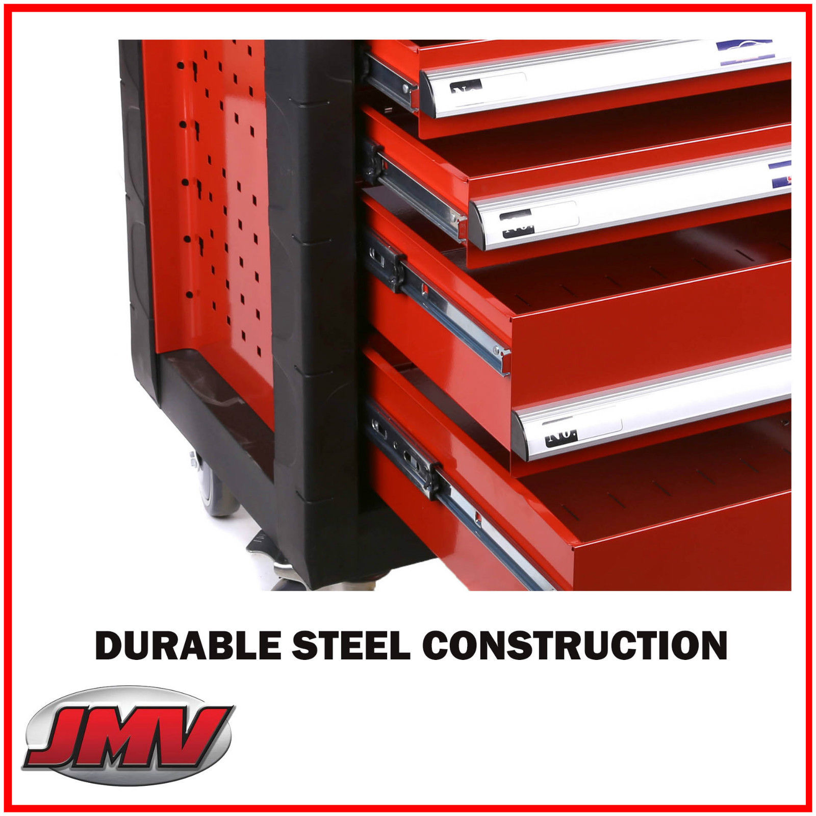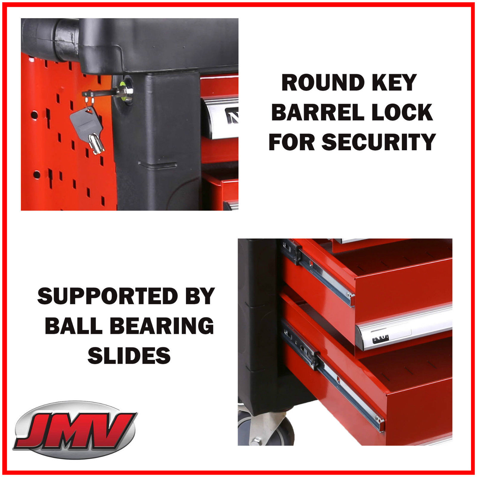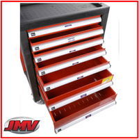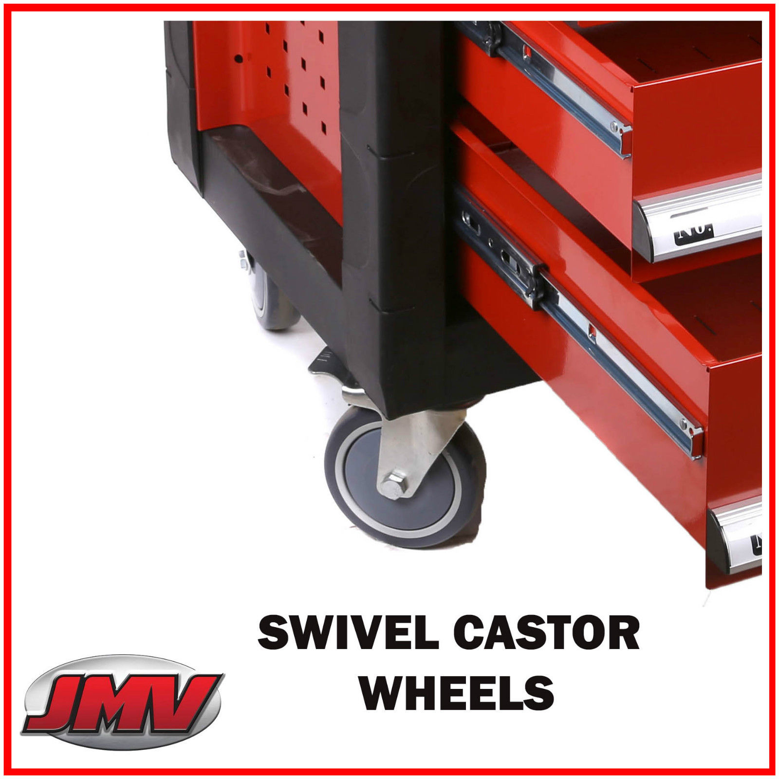Use this handy JMV workshop tool trolley with 7 sliding drawers to store and organise your tools. Features sturdy swivel castor wheels for easy manoeuvrability. Made with high quality steel construction for durability and strength. Includes a round key barrel lock for security as well as supported by ball bearing slides.