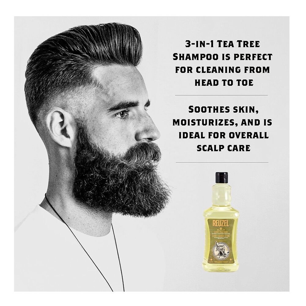REUZEL 3-IN-1 Tea Tree Shampoo, Conditioner, and all over Body Wash is perfect for cleaning from head to toe. 3-IN-1 Tea Tree Shampoo soothes skin, moisturizes and is ideal for overall scalp care. THE BREAK DOWN: Cleanses Hair, Face & Body. Conditions Hair & Skin. Refreshing Aroma of Spearmint Tea Tree. Rinses Clean With No Added Residue. Can Be Used Daily. THE GET DOWN: Apply to wet hair and skin. Rinse thoroughly.