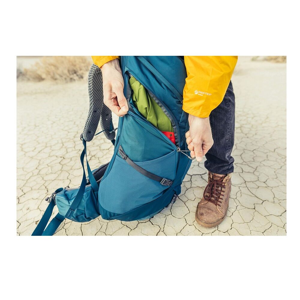 - Dual side stretch mesh pockets, one with side trail access, with pass through for over or under compression