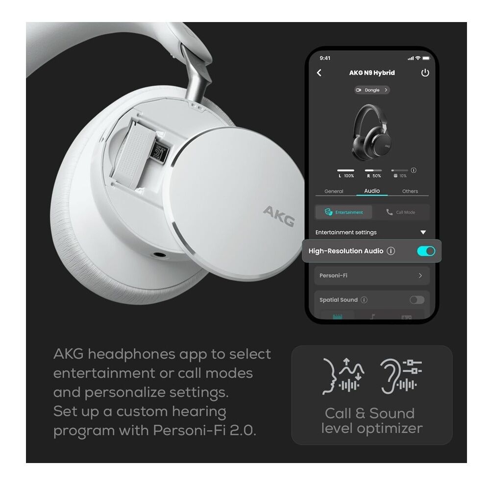 The AKG N9 Hybrid offers premium over-ear audio with hybrid noise cancelling and exceptional connectivity. Seamlessly switch between Bluetooth® and 2.4 GHz USB-C dongle for ultra-reliable wireless audio, whether you’re working, gaming, travelling or on calls. Featuring AKG’s Hi-Res sound quality, immersive spatial audio, adaptive ANC and Zoom-certified call performance, these headphones are built for everyday use and extended listening sessions.