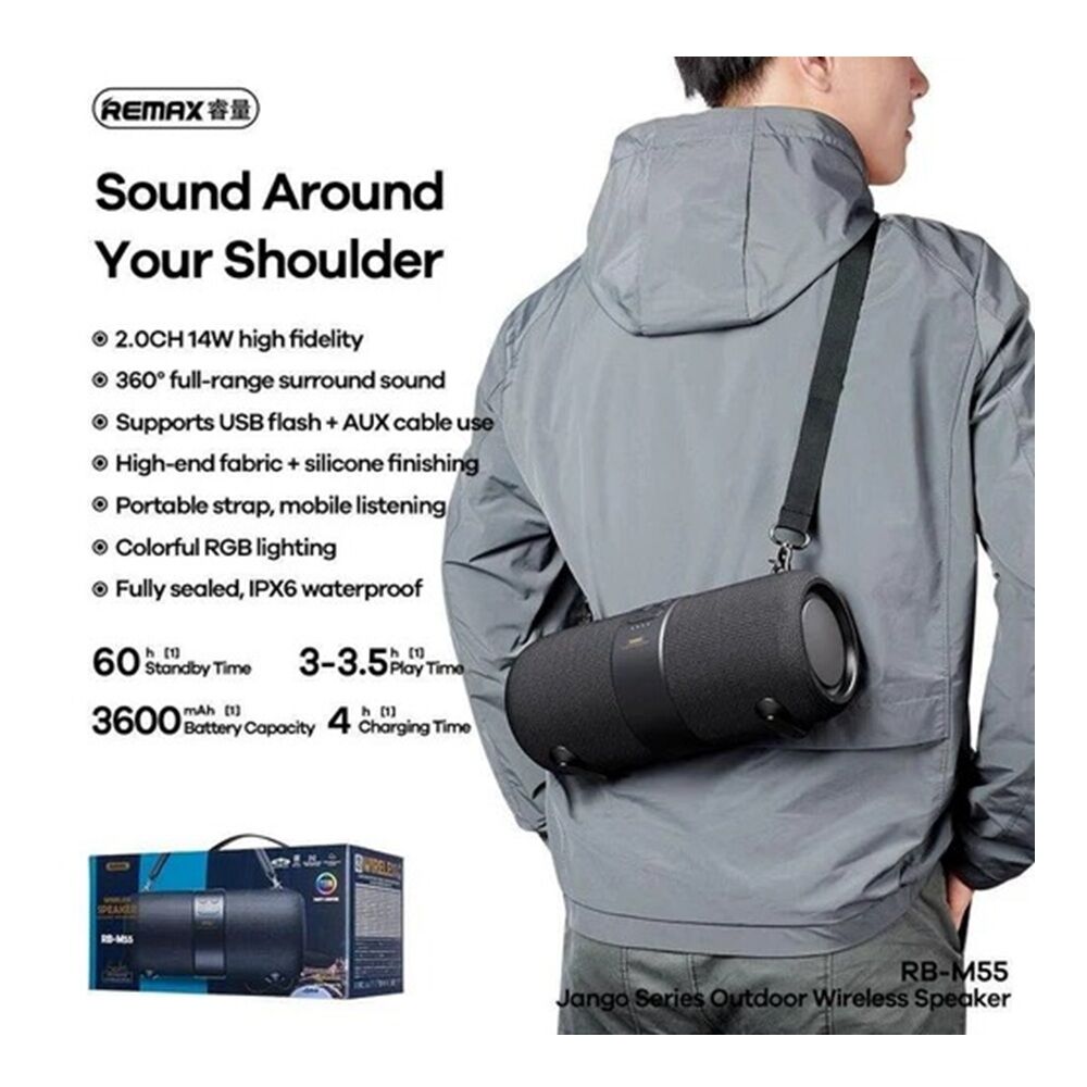 Remax RB-M55 Wireless Bluetooth Speaker comes with a lanyard for portability. There are RGB lights to add beauty. The material is ABS plastic, thick and strong, covered with fabric. Able to connect two speakers at the same time, true wireless stereo with a built-in mic, can receive voice calls through the speaker. There is a light to show the working situation. Support wireless connection via bluetooth, wired via AUX port, support flash drive. Waterproof in ipx6 level. Comes with a control button to play music And adjust the volume from the speaker. Type-C port for recharging the battery stored in the speaker. Covered with fabric Able to connect two speakers at the same time, True wireless stereo With a built-in mic, can receive voice calls through the speaker. Specifications: Model: Rb-M55, Bluetooth version: V5.0, Battery: 3600mAh, Effective distance: 10 meters, Standby Time: 35h, charging time: 4-5H, Play time:3h.