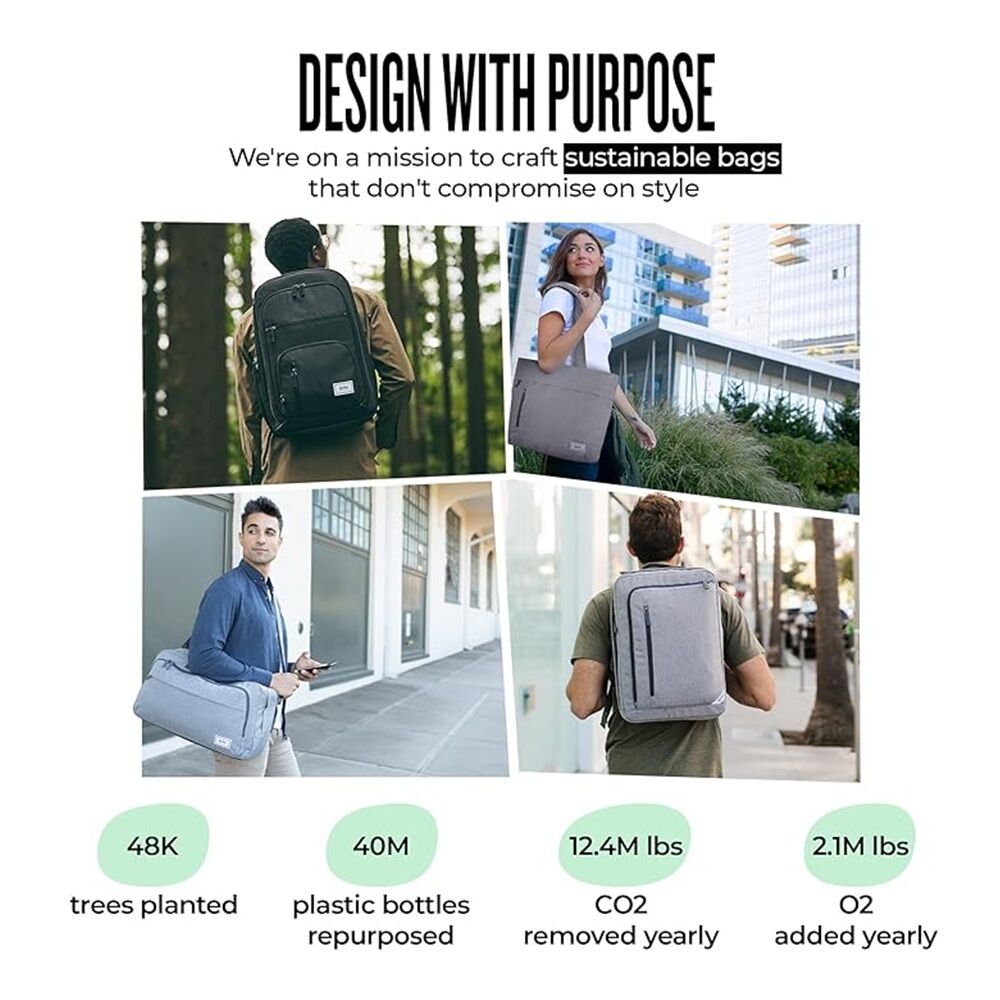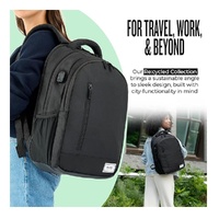 The Re:Define Laptop Backpack (18" x 13" x 7") is perfect for commuters and travelers. The exterior heathered grey material is made out of Recycled PET bottles, providing a sustainable choice to carry your belongings. You can easily wipe down the surface with a damp cloth to clean. This backpack is feature rich with a checkpoint friendly design, allowing you to pass through airport security with ease. Recharge your phone or other electronics with the external USB port. It even comes with a headphone port so you can feed your wires through the backpack for a hands free experience. Tired of carrying your backpack? The external back strap slides over most luggage handles so you can travel with ease. This bag comes with a 5 year warranty.