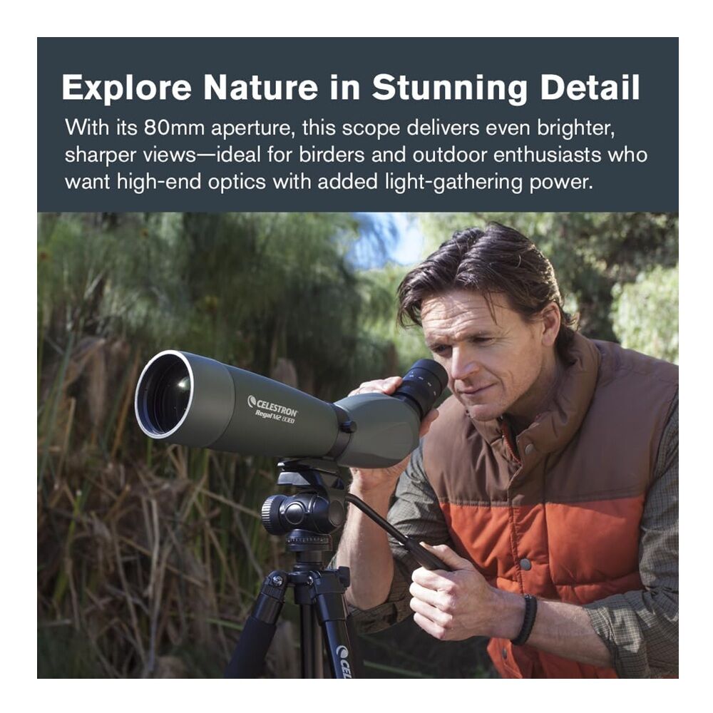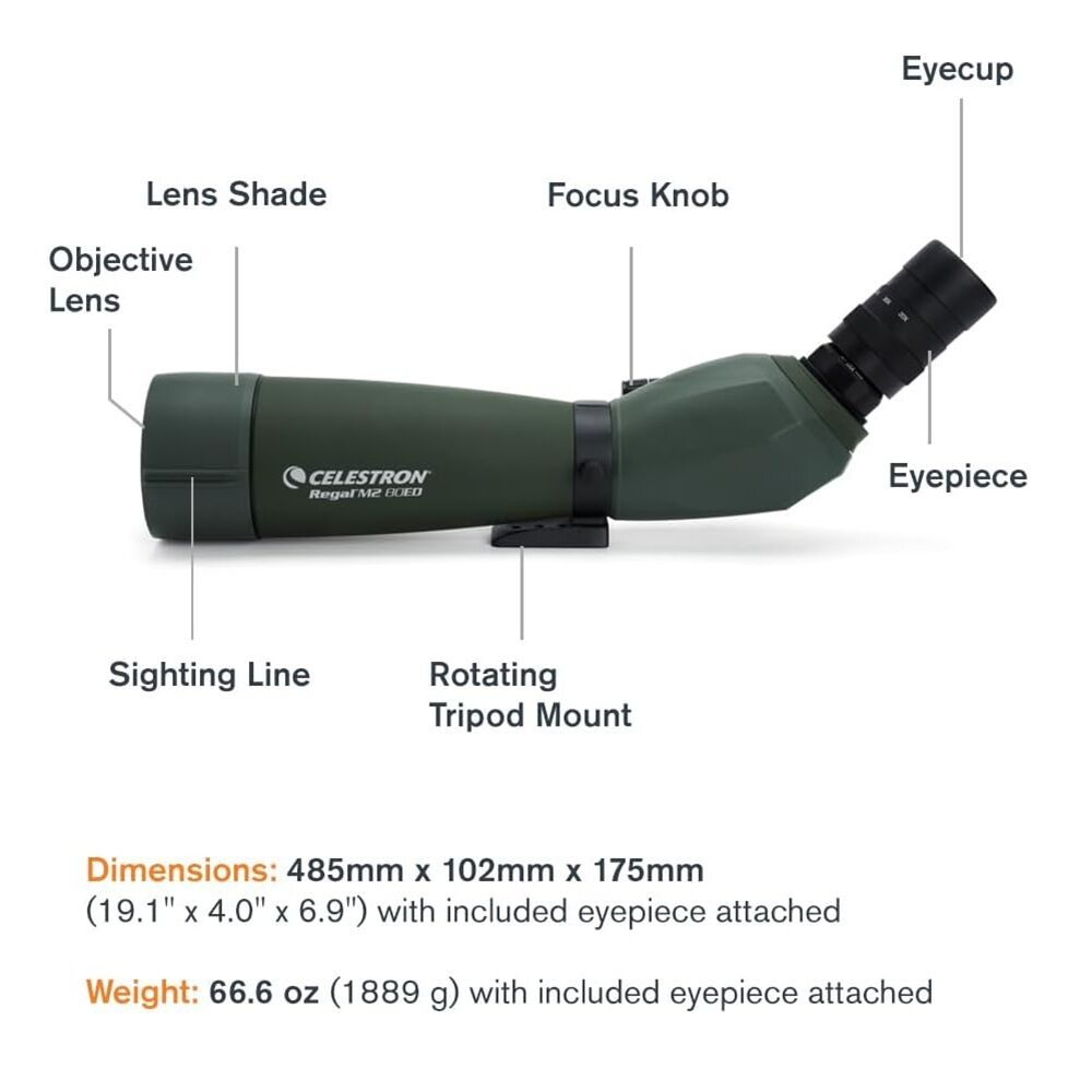 - INCLUDES ESSENTIALS FOR BETTER VIEWING: The Celestron Regal M2 80ED includes a padded view-through case, an objective cover, eyepiece cover, storage covers for the eyepiece and eyepiece port, a T-mount adapter for attaching your DSLR camera for digiscoping, a cleaning cloth, and an instruction manual.