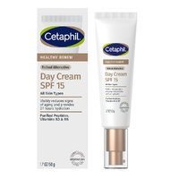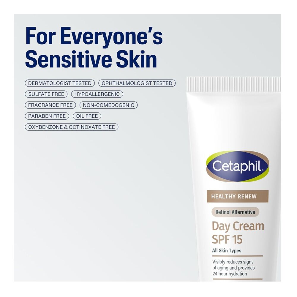 Cetaphil Healthy Renew is the gentle retinol alternative to healthy aging specially designed by dermatologists for sensitive skin. Decrease the appearance of fine lines and visibly improve skin’s tone, texture and glow in 2 weeks. Cetaphil Healthy Renew Day Cream SPF 15, visibly reduces signs of ageing and provides 24 hours hydration. Visibly reduces signs of aging to leave skin looking younger and rejuvenated. Helps to protect sensitive skin from photoaging caused by damaging UVA and UVB rays. Protect your sensitive skin every day with Cetaphil Healthy Renew Day Cream SPF 15, developed by dermatologists. This daily use face moisturizer with SPF 15 hydrates and visibly smooths the look of fine lines while helping protect against UV rays. Powered by retinol alternative, purified peptides, this Day Cream is clinically proven to help reduce the visible signs of aging while being gentle on even the most sensitive skin. This anti-aging face cream also contains vitamins B3 (niacinamide) and B5 (panthenol) to help hydrate and soothe the skin barrier, plus botanical extracts (rice lees and edelweiss) to target visible dullness and uneven skin tone. This non-greasy formula absorbs quickly and provides long lasting hydration for up to 48 hours as well as daily protection from harmful UVA/UVB rays. It defends against 5 signs of skin sensitivity - dryness, irritation, roughness, tightness and a weakened skin moisture barrier.