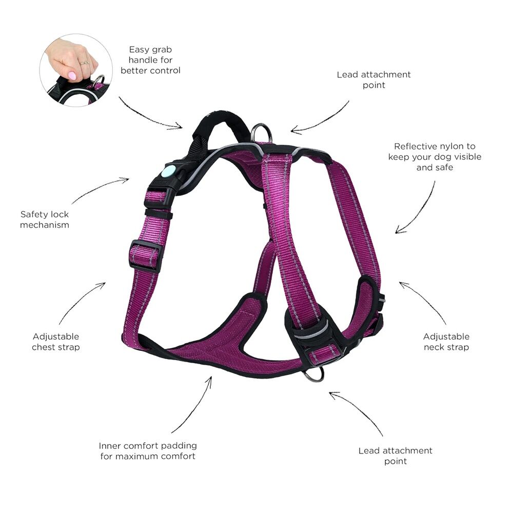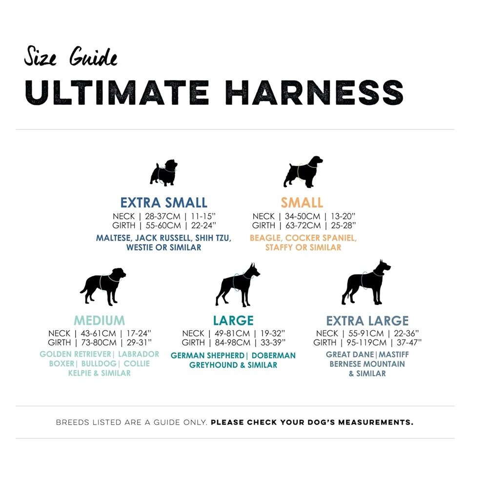 The Ultimate Harness has been designed for safe and secure control, featuring dual lead attachment points and an easy-grab handle for better control. It includes inner comfort padding and adjustable neck and chest straps for a comfortable and secure fit. Additionally, it has a safety lock buckle and reflective trim for extra safety and visibility. The Ultimate Harness is the perfect accessory for your dog’s outdoor adventures.