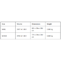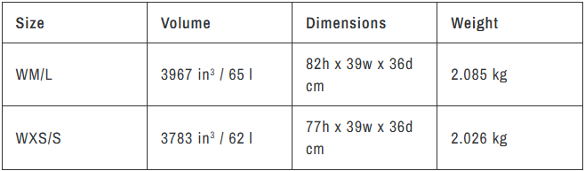 - WXS/S: 3783 in3 / 62 l / 77h x 39w x 36d cm / 2.026 kg