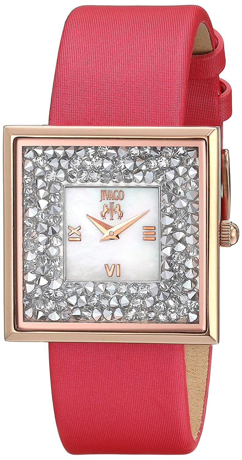 JIVAGO Brilliance women’s watch featuring a white mother of pearl dial with crystals, a rose gold-tone stainless steel case and a pink leather band. Model JV7413. Comes in Gift Box.